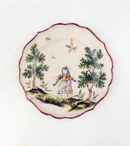 - NOTIZIE STORICO CRITICHE Piatto medio parte di un assortimento formato da centoquarantotto pezzi decorato "a paesini e figure a smalto" (cfr. Inventario manifattura Clerici 1788, A.S.M., Commercio 199), databile dopo il 1756, anno di adozione della tecnica a piccolo fuoco nella manifattura. A questa raccolta appartiene un piatto con la marca di Felice Clerici e la data 1767 (n. INV. 2338) (cfr. Ausenda, in Museo Arti, 2001).
