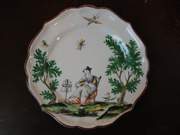 Piatto medio sagomato a quattro punte con orlo color bruno ornato con figura femminile seduta che fila tra due alberi.