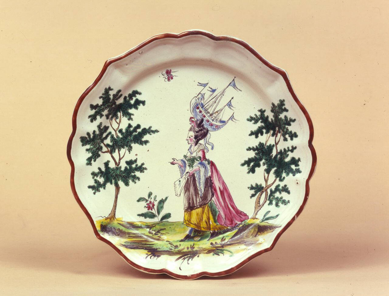 Tazza da brodo bombata, sagomata, con manici a conchiglia, coperchio con orlo bruno e pigna apicale. Decorazione con figure femminili con cestino fra due alberi.
