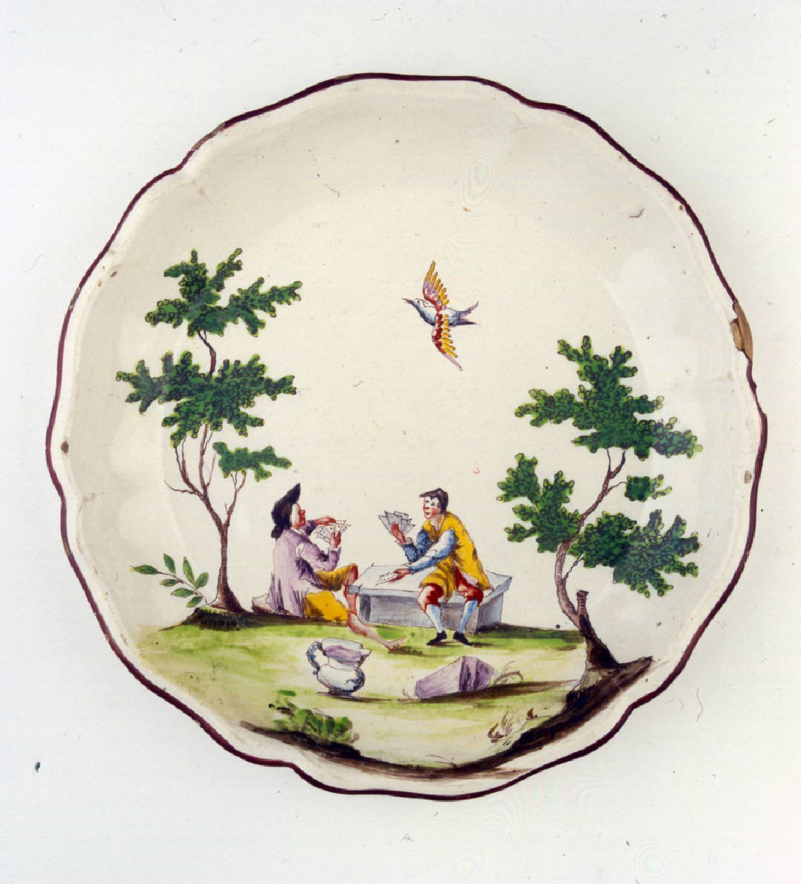 Piatto fondo sagomato a quattro punte con orlo color bruno ornato con due giocatori di carte tra due alberi.