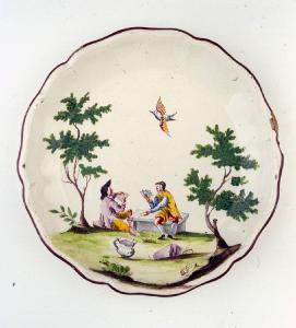 - NOTIZIE STORICO CRITICHE Piatto fondo parte di un assortimento formato da centoquarantotto pezzi decorato "a paesini e figure a smalto" (cfr. Inventario manifattura Clerici 1788, A.S.M., Commercio 199), databile dopo il 1756, anno di adozione della tecnica a piccolo fuoco nella manifattura. A questa raccolta appartiene un piatto con la marca di Felice Clerici e la data 1767 (n. INV. 2338) (cfr. Ausenda, in Museo Arti, 2001).