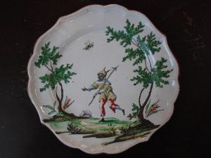 Piatto medio sagomato a quattro punte con orlo color bruno ornato con moretto con lancia tra due alberi.