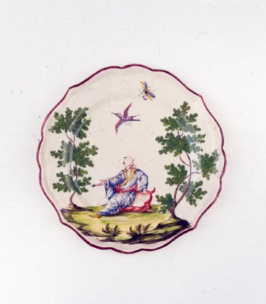 Piatto medio sagomato a quattro punte con orlo color bruno ornato con figura maschile orientale seduta con pipa tra due alberi.