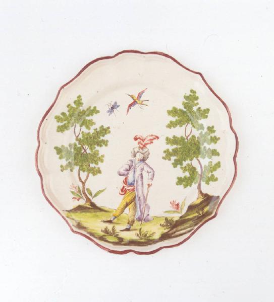 Piatto medio sagomato a quattro punte con orlo color bruno ornato con figura di giovane con vesti orientali tra due alberi.