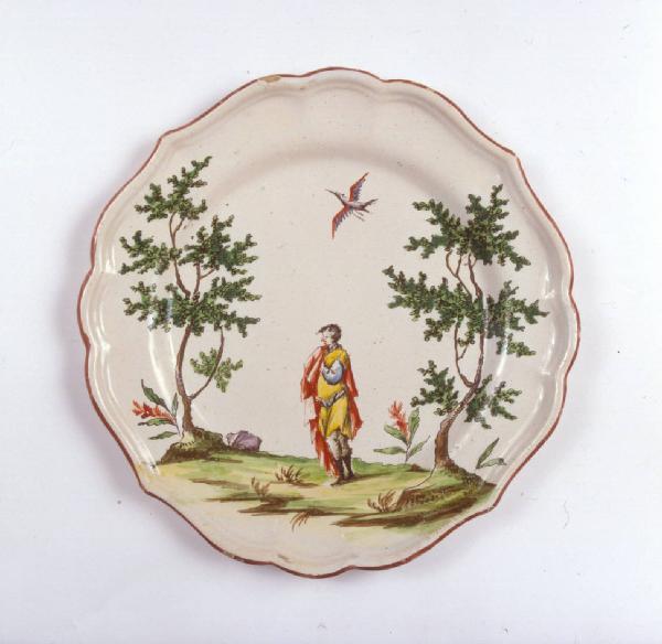 Piatto sagomato a quattro punte, bordo profilato di color bruno. Decorazione con figura di aristocratico fra due alberi, uccello.