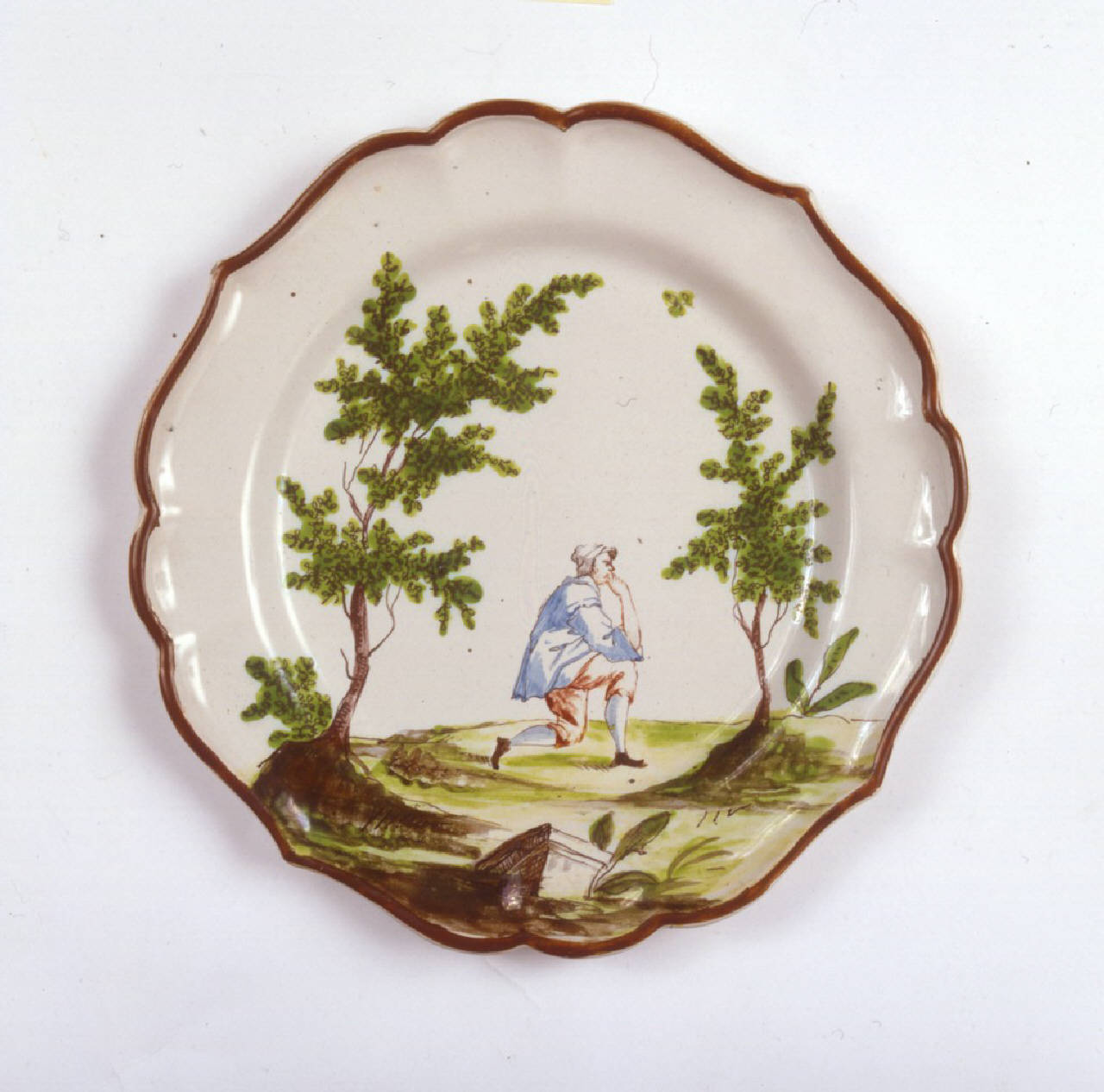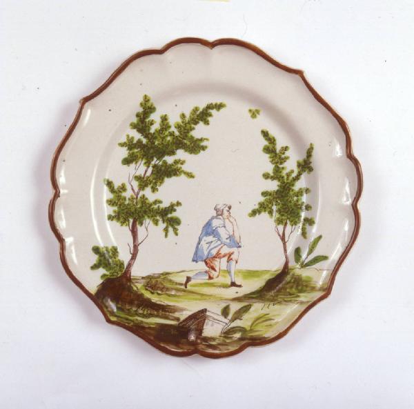 Piatto sagomato a quattro punte, orlo bruno. Decorazione con figura maschile inginocchiata fra due alberi e barca imn primo piano.