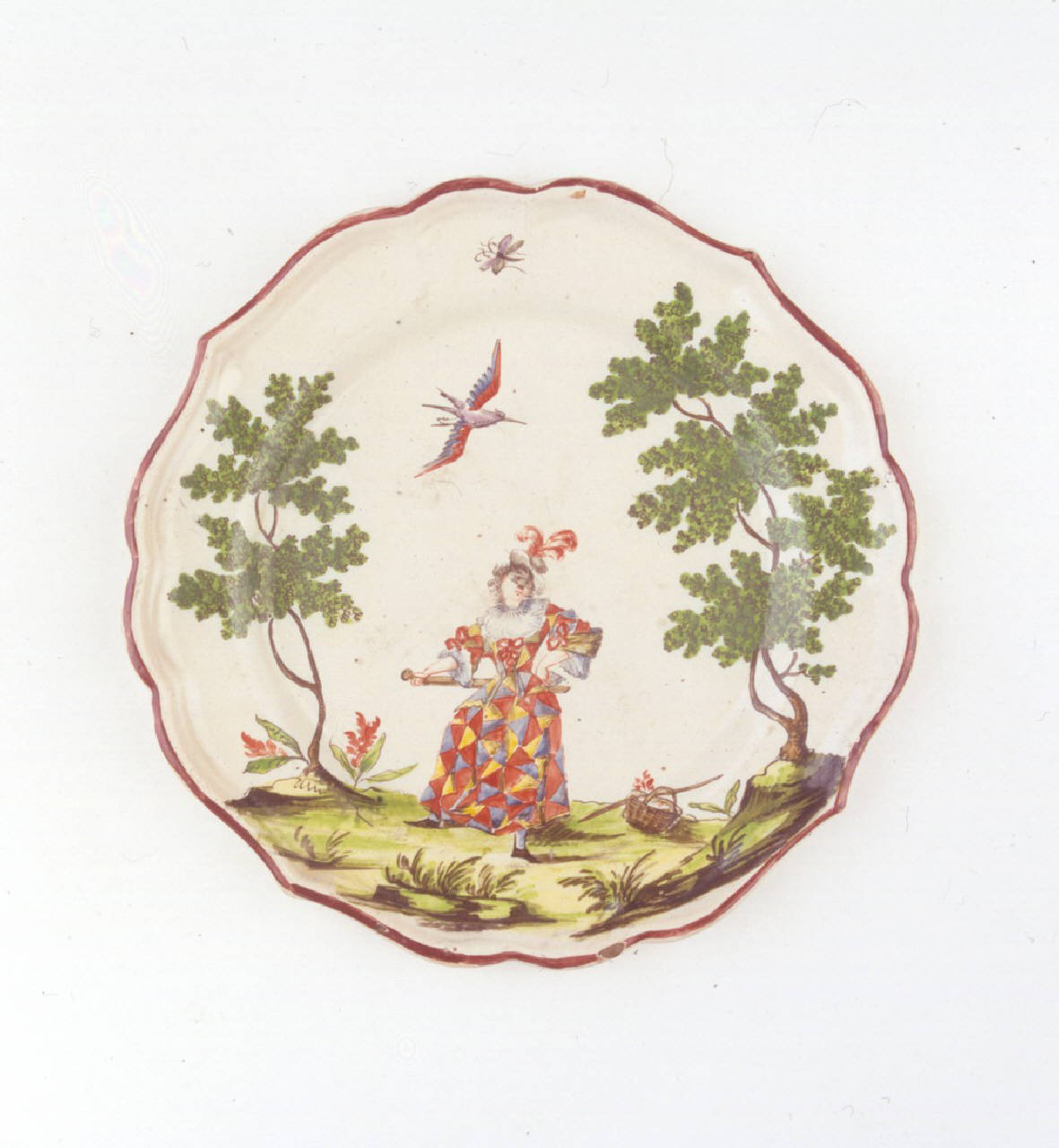 Piatto medio sagomato a quattro punte con orlo color bruno ornato con figura femminile della Commedia dell'Arte tra due alberi.