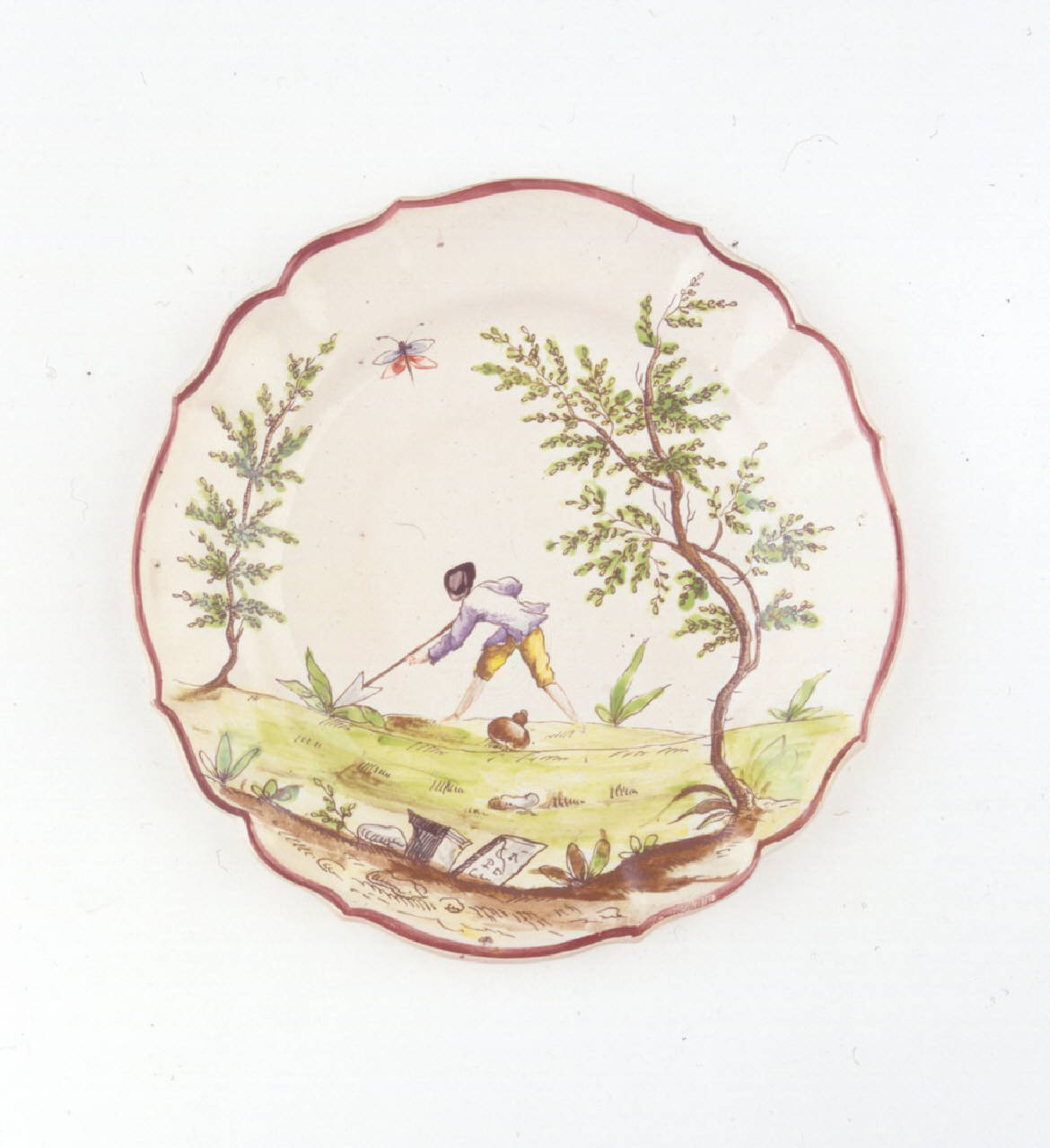 Piatto piano sagomato a quattro punte con orlo color bruno ornato con figura maschile di schiena che lavora la terra tra due alberi.