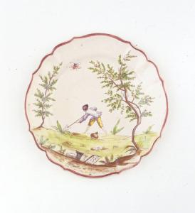 - NOTIZIE STORICO CRITICHE Piatto parte di un assortimento formato da centoquarantotto pezzi decorato "a paesini e figure a smalto" (cfr. Inventario manifattura Clerici 1788, A.S.M., Commercio 199), databile dopo il 1756, anno di adozione della tecnica a piccolo fuoco nella manifattura. A questa raccolta appartiene un piatto con la marca di Felice Clerici e la data 1767 (n. INV. 2338). Il piatto in esame, tuttavia, è di altra mano (cfr. Ausenda, in Museo Arti, 2001).
