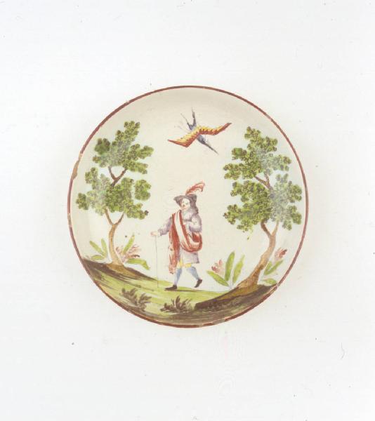Piattino da caffè circolare con bordo profilato di color bruno. Decorazione con figura maschile in cammino fra due alberi.