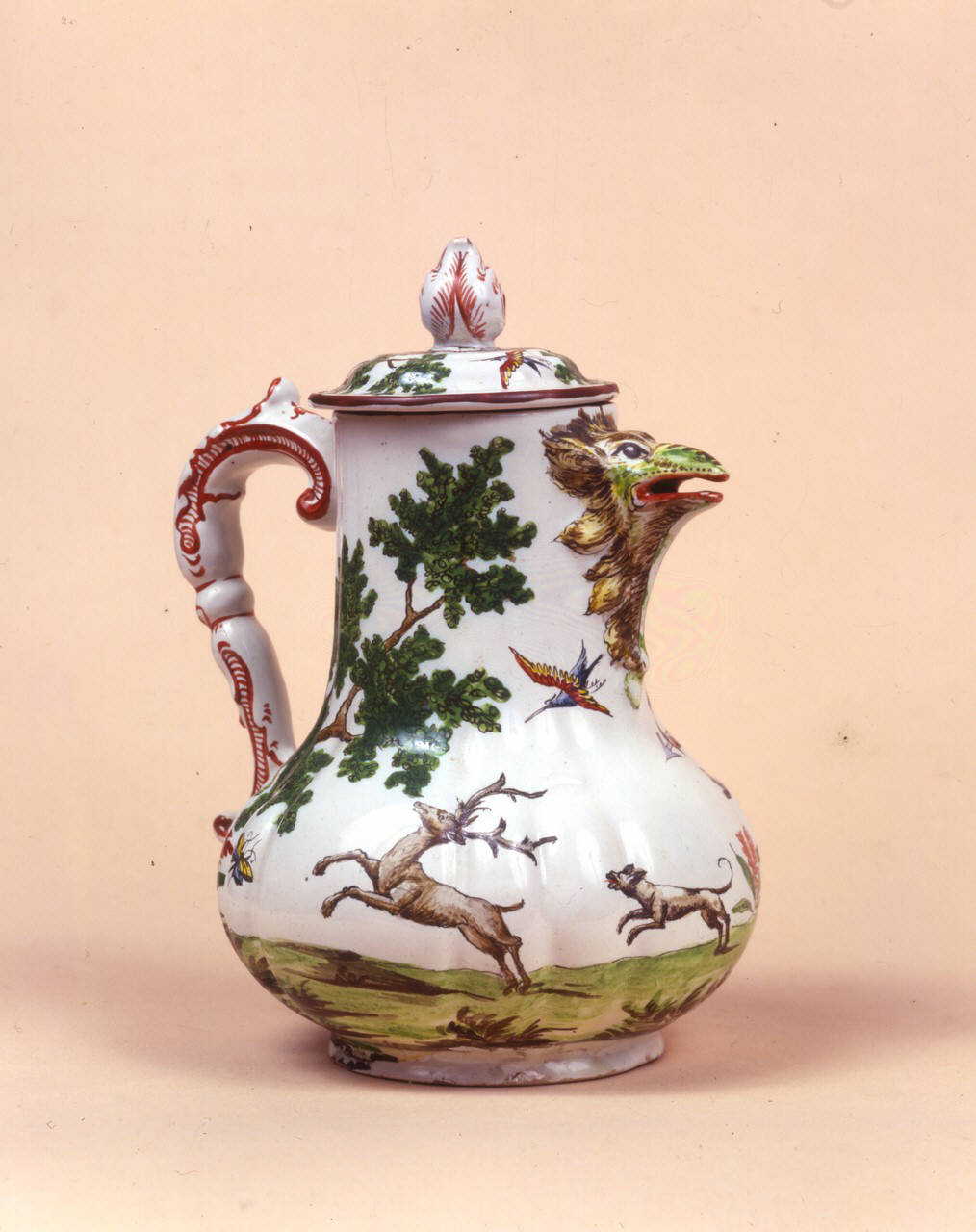 Caffettiera dal corpo bombato, baccellato, lungo collo e versatore a becco di grifo. Manico curvilineo, coperchio con pigna apicale. Ornato con scena di caccia.