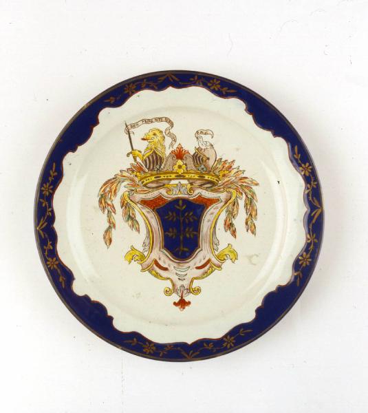 Piatto tondo, orlo liscio, tesa inclinata. Decorazione con cornice a graffe in blu ornata da motivi decorativi vegetali oro. Al centro stemma
