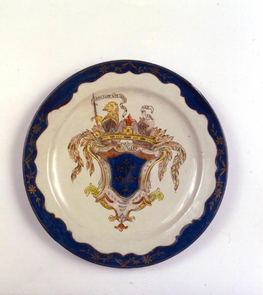 Piatto tondo, orlo liscio, tesa inclinata. Decorazione con cornice a graffe in blu ornata da motivi decorativi vegetali oro. Al centro stemma.