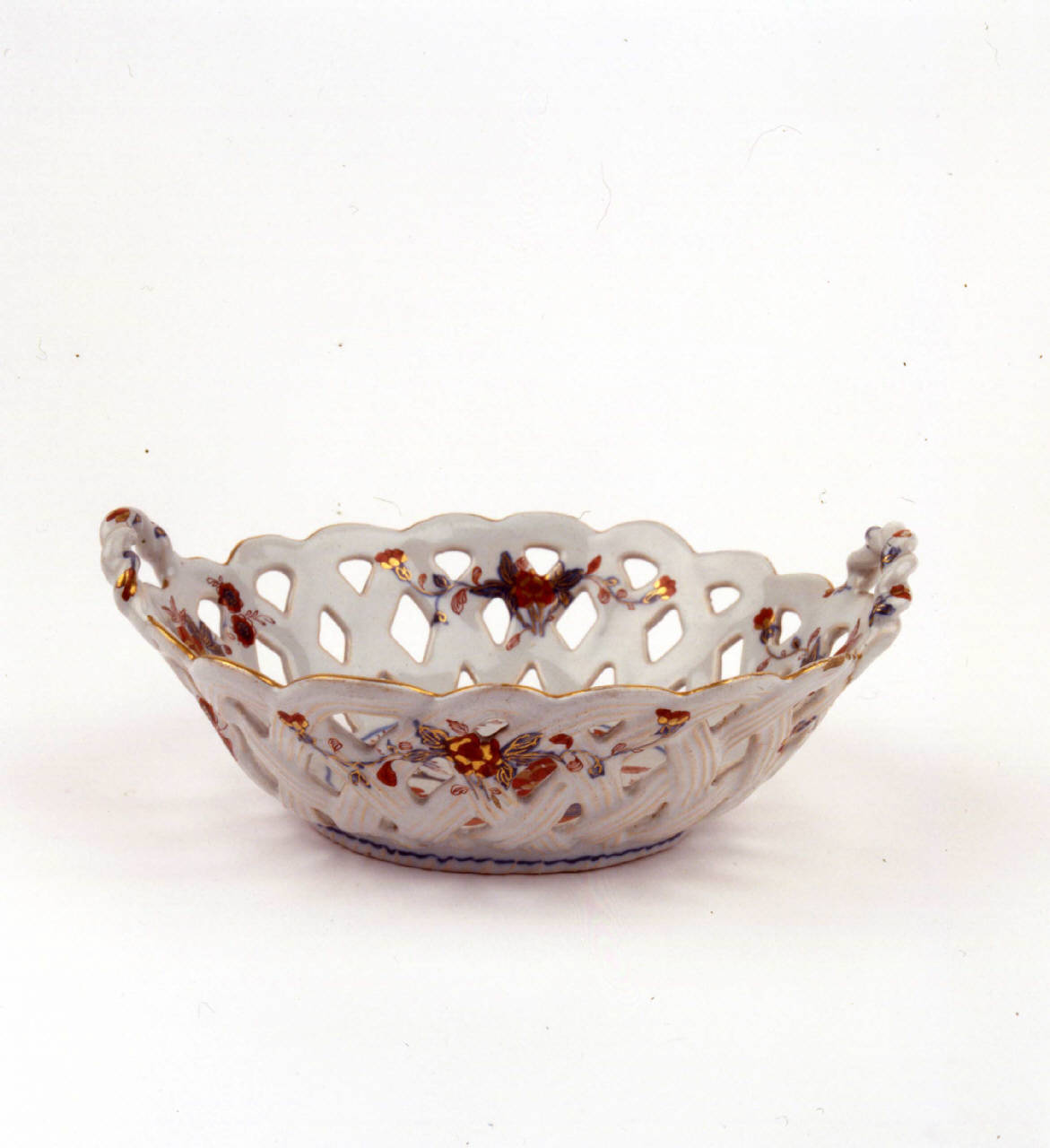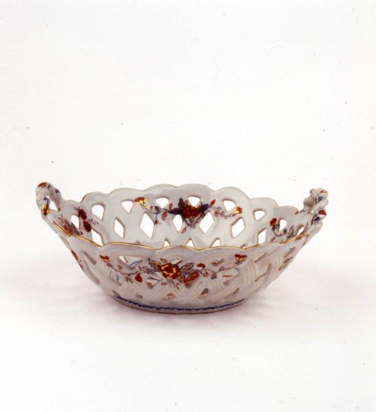 Cestello ovale, svasato, traforato a giorno con manici intrecciati. Decorazione policroma e oro di gusto giapponese. All'interno, incorniciati da un filetto blu, da un terreno, emergono due rami turchini con peonia centrale e altri piccoli fiori. Sulla spalla quattro piccoli gruppi floreali con peonia centrale affiancata da tre fogliette blu da cui si dipartono steli sinuosi con fiori. Orlo profilato in oro.