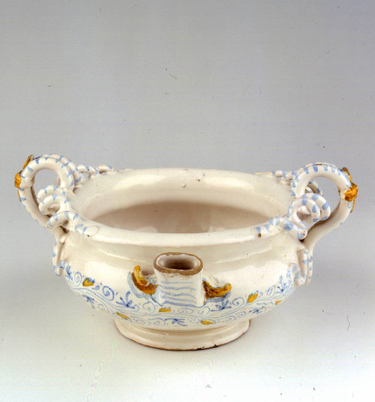 Corpo emisferico, ampia bocca con orlo estroflesso, piede svasato. Manici serpentiformi a doppio tubo, beccuccio versatore a culindro schiacciato al centro. All'interno del cavetto della coppa è dipinto la figurina di Eros. Decorazione a ghirlanda all'esterno.