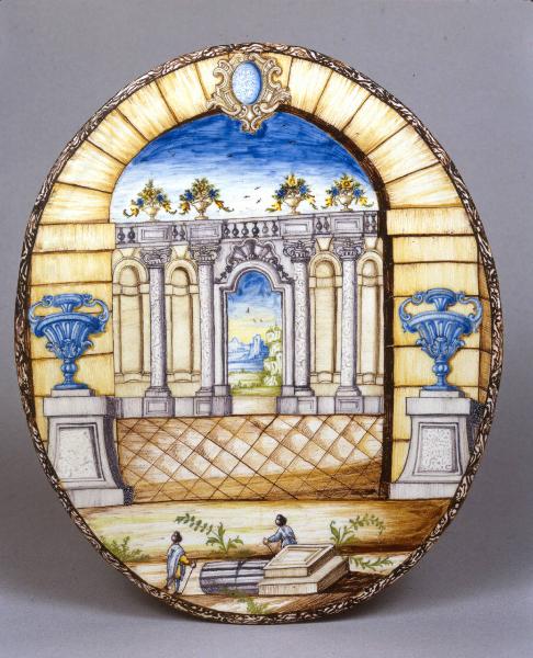 Piastra ellittica piana, foggiata a stampo. Smalto bianco dipinto in blu, giallo, verde, bruno e manganese, cornice a sottile fascia con racemi schematici in manganese.\nAll'interno di un grande portale con due anfore su basamento e uno stemma all'estradosso si apre la veduta su un palazzo nobiliare con facciata scandita da colonne e sormontata da balaustra con vasi di fiori. In primo piano due piccoli viandanti fra rovine. Verso rivestito irregolarmente da smalto sottile con striature di foggiatura e aree scure riferibili ai supporti di infornatura. Priva di marca.