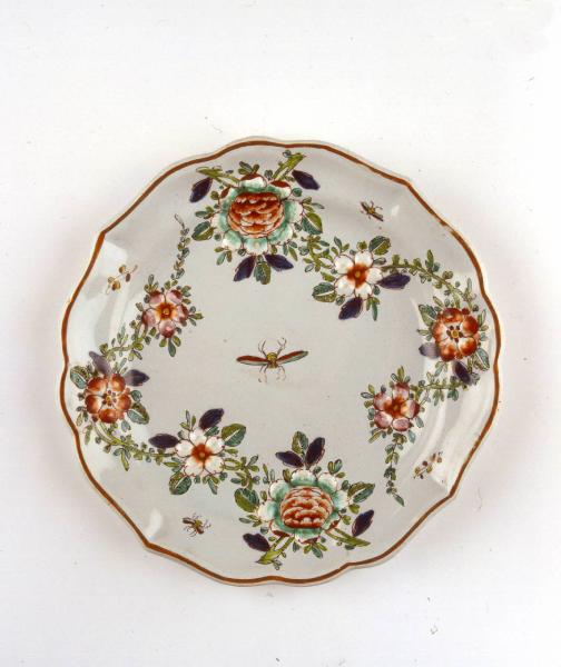Piatto piano dall'orlo rosso-bruno mistilineo decorato con fiori a rilievo, racemi, insetti.