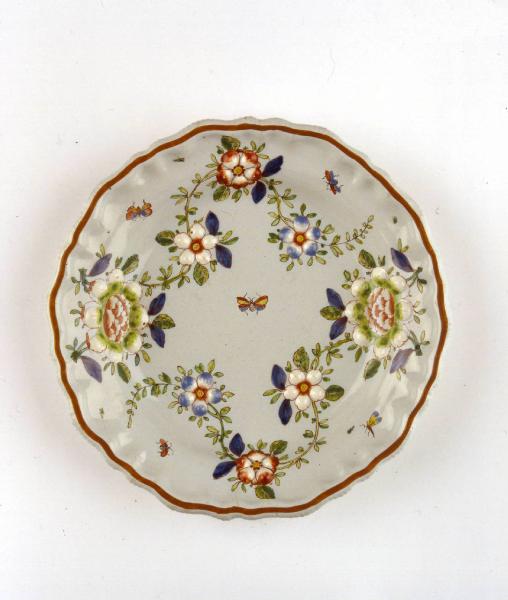 Piatto fondo dall'orlo rosso-bruno mistilineo decorato con fiori a rilievo, racemi, insetti.