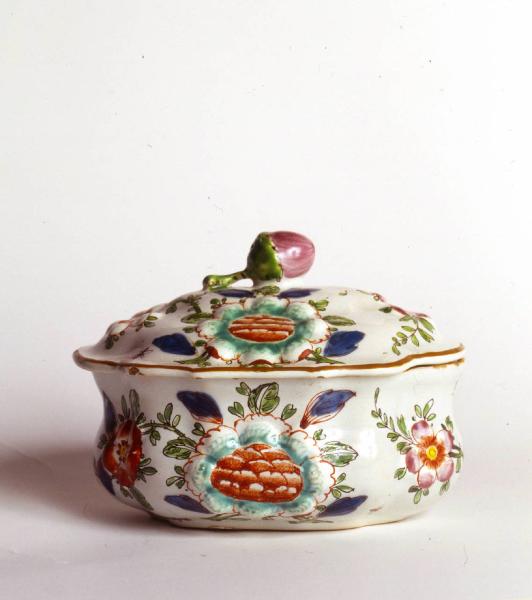 Zuccheriera con coperchio con orlo rosso-bruno sagomato. Corpo svasato, leggermente baccellato, decorazione con fiori a rilievo, racemi, insetti.