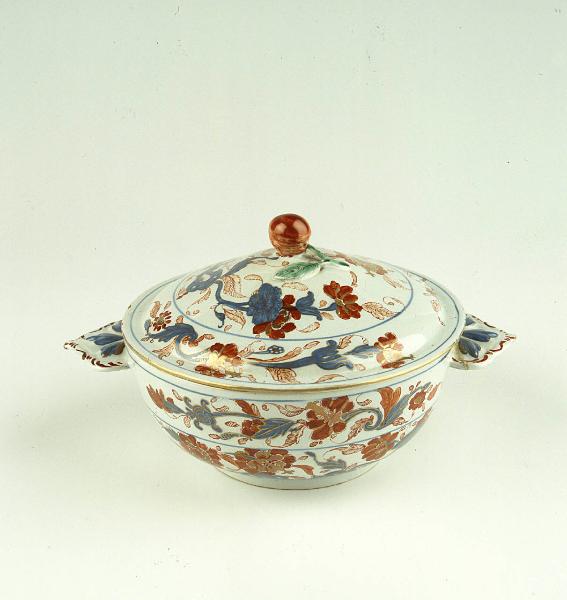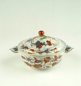 Tazza da brodo con prese piatte a foglie rilevate. Corpo svasato, coperchio con pomolo, decorazione floreale di gusto giapponese.