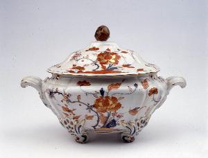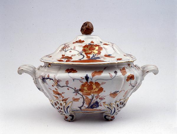 Zuppiera ovoidale con corpo espanso, con manici a voluta e piedini a forma di foglia traforati. Coperchio cuspidato, presa a forma di castagna. Decorazione floreale di gusto giapponese con tralci di peonia, fiori rossi, turchini e lumeggiature oro.