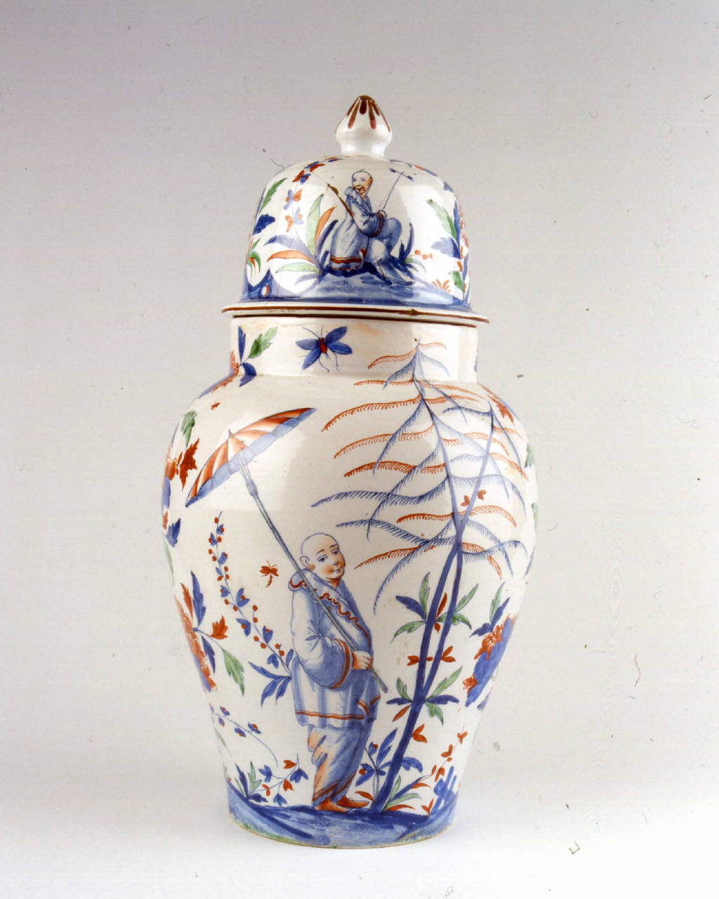 Grande vaso/potiche con base a disco pieno, corpo a balaustro con spalla rigonfia, corto collo cilindrico, coperchio ad alta calotta con presa affusolata e corta tesa. Smalto azzurrato, lucido e brillante, decoro a tavolozza insolita in chiaroscuro blu con aggiunta di bruno di manganese, verde ramina e rosso ferro a gran fuoco. Decorazione dipinta costituita su un lato da steli con grandi fiori alternata a una grande figura di cinesino sorridente con un ombrellino sulla spalla e a lato un pino con fronde aghiformi. Coperchio con una figurina di cinese seduto con una girandola e un grande uccello.