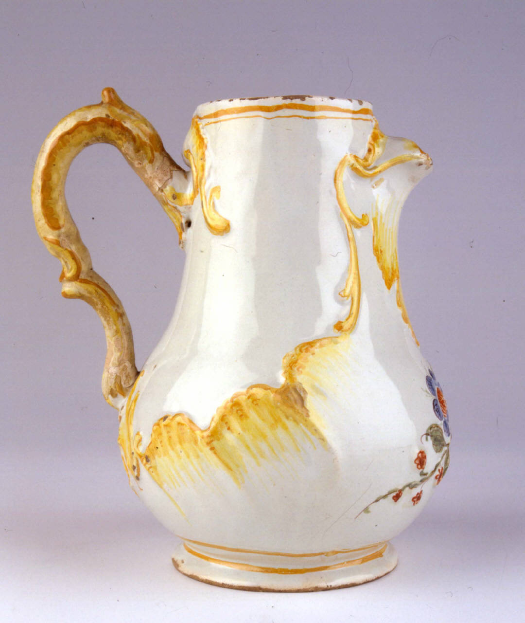 Caffettiera su basso piede con corpo periforme e alto collo che si restringe fino alla bocca. L'ansa a doppio ricciolo è movimentata da un'increspatura rocaille a rilievo chiaroscurata in giallo. Sulla pancia è modellato a leggero rilievo un ramo reciso con due grandi fiori esapetalati dipinti in rosso e azzurro.