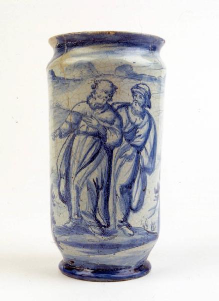 Albarello a corpo cilindrico, spalla e base poco carenati, collo defluente e orlo estroflesso, piede a disco. Invetriato con coperta di ossido di stagno opacizzante dipinto in monocromia turchina. Sono raffigurate due figure intere di apostoli. Sul verso un cherubino regge in cartiglio con iscrizione.