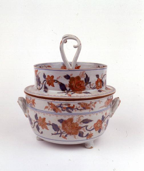 Gelatiera composta da secchio cilindrico su tre piedini a bottone con anse laterali a staffa, scodella interna con tesa di appoggio al primo recipiente, coperchio circolare con alto bordo cilindrico, presa a cruna formata da due cordoli sovrapposti e arricciati. Motivo decorativo Imari "a peonie e carpe". La decorazione è organizzata su fasce filettate in azzurro, in quella inferiore sono grosse peonie accompagnate da fiori di ibiscus e altre inflorescenze nella tricromia rosso, blu e oro. Questo stesso decoro compare sul coperchio. La seconda fascia che orna il secchio vede alternarsi fiori recisi a grosse carpe in rosso che nuotano tra alghe.