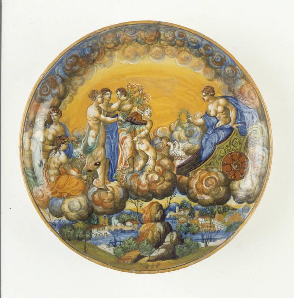 - NOTIZIE STORICO CRITICHE Intorno alla coppa in esame il Mallet (1980) ha riunito una serie di opere assegnadole al "Pittore del Pianeta Venere". L'iscrizione ci indica che è stata eseguita a Pesaro nel 1544. Il soggetto iconografico si ispira all'incisione dedicata a "Venus" della serie dei Sette Pianeti (cfr. Biscontini Ugolini, in Museo Arti 2000). Provenienza: aquisto dal Dott. Carrara, Bergamo 1979; vendita Sotheby 1969; Antiquario Squattriti, Roma.