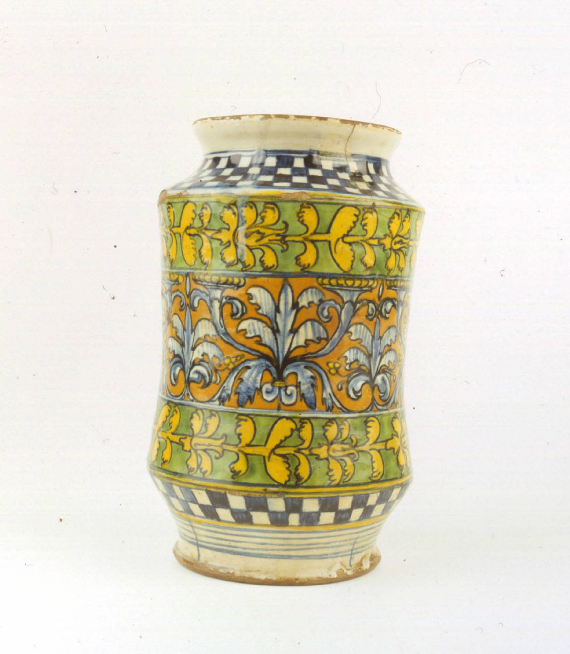 Albarello a corpo cilindrico leggermente rastremato, orlo estroflesso su breve collo, base poco espansa su piede a disco. Modellato a tornio, decoro dipinto in blu scuro, verde chiaro, giallo e arancio. Ornato a fasce su tutta la superficie del vaso, al centro cornucopie e motivi vegetali classici delimitata da due fasce più basse di fregi correnti a elementi fogliati. Sulla spalla e alla base motivo a scacchiera.