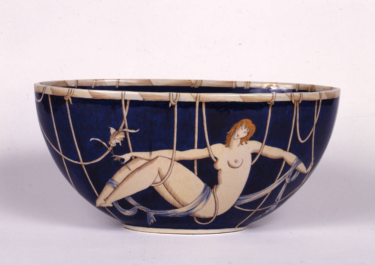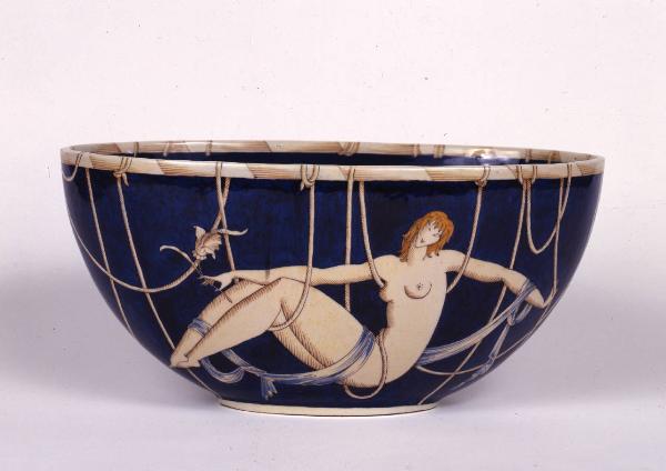 Ciotola ovale blu decorata con una donna ignuda distesa su un intreccio di corde che pendono dal bordo. La donna tiene un fiore nella mano sinistra, mentre un leggero drappo corre intorno al suo braccio destro, al grembo e al piede sinistro.