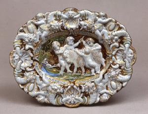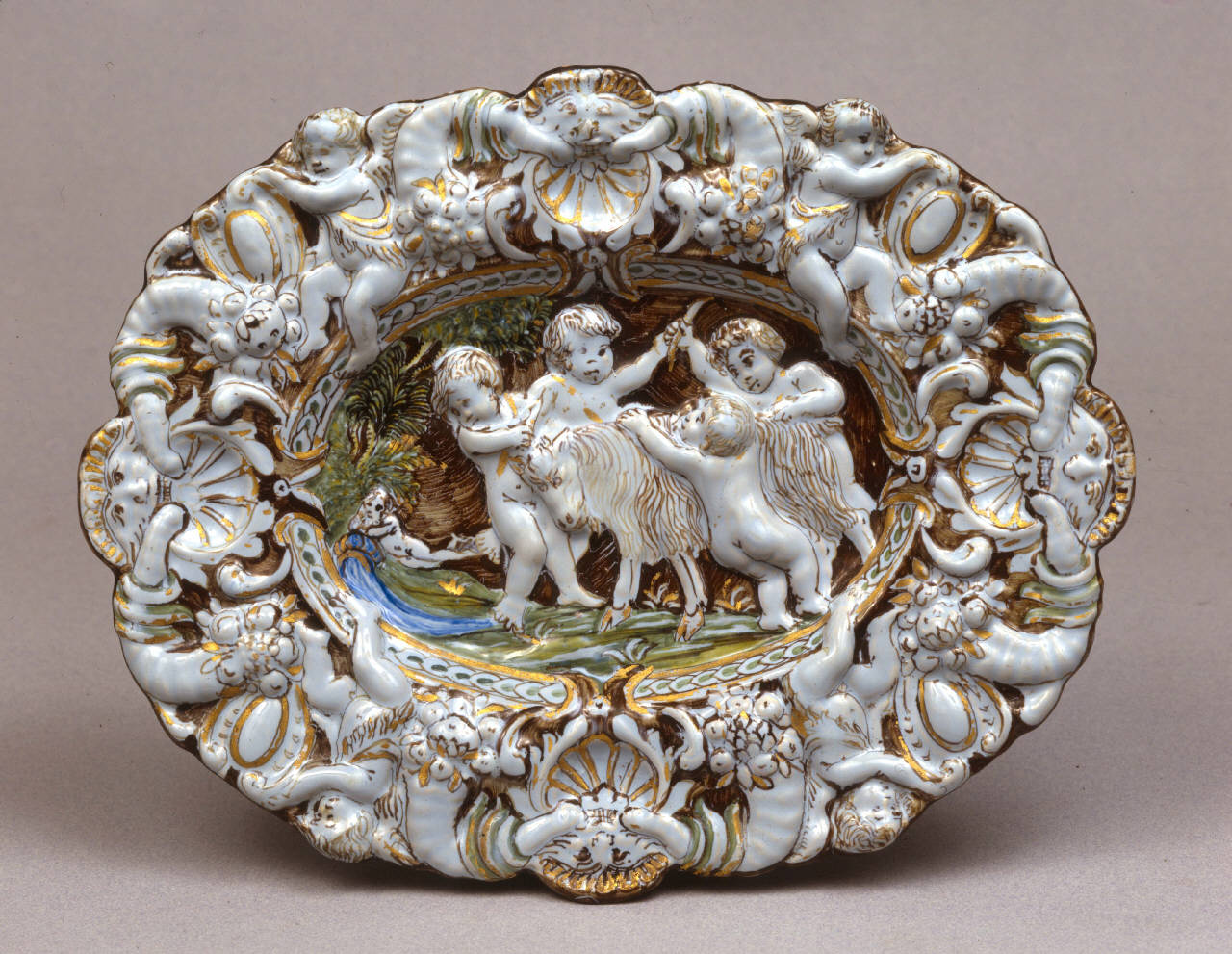 Vassoio ellittico con parte della parete e della tesa a rilievo, orlo mistilineo, base apoda convessa. Foggiato a stampo. Nel fondo quattro putti intorno a una capra, forse intenti a tosarla con l'oggetto che è in mano al putto più a destra. A sinistra personificazione di un fiume. Fra scena e tesa motivo a catenella, tesa con quattro putti alati che reggono scudetti alternati a mascheroni fra due cornucopie. Diffuse lumeggiature in ora a freddo, nella tesa tocchi di verde, dettagli delle figurazioni e della campitura dello sfondo in manganese. Smalto grigio-azzurro. All'esterno in corrispondenza di parete e tesa, quattro piantine schematiche alternate a serpentine. Marca assente.