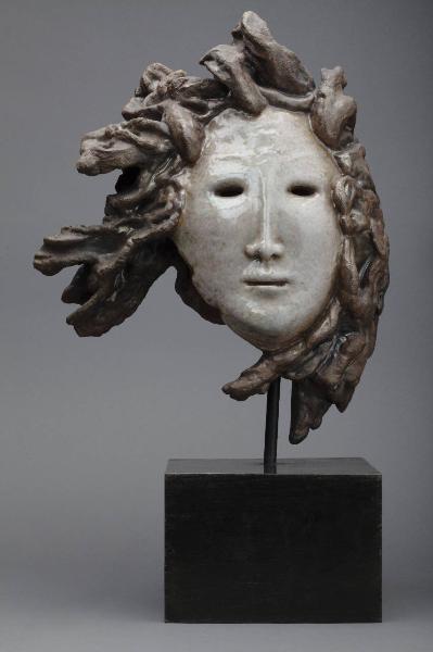 Scultura raffigurante un volto femminile, tipo maschera senza occhi, con capelli alzati dal vento, fissata con un asta ad una base quadrata in legno dipinto di nero.