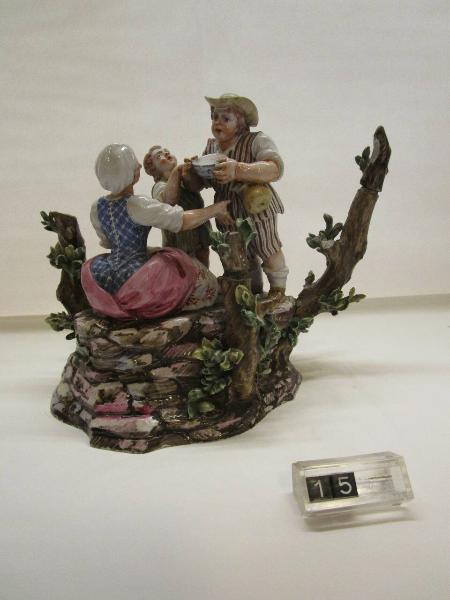 Gruppo su base ovale e a decorazione policroma. La base simula un muretto in pietra dal quale spuntano felci e sporgono tronchi d'albero; sul muretto una donna è seduta di spalle, un uomo ha tra le mani una ciotola che il bambino accanto a lui cerca di prendere tra le mani. Il tronco dietro l'uomo ha un ramo spezzato.