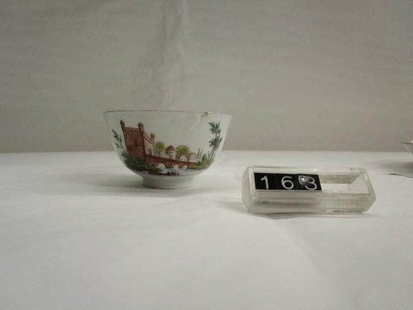 Scodellina da caffè a decorazione policroma su smalto bianco di paesaggio turrito e di ponte a tre archi su di un fiume; intorno rami e fiorellini. Orlo interno ad arabeschi dorati e un tralcio fiorito.