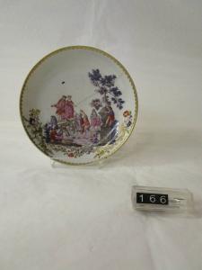 Piattino a decorazione policroma con la figura di una dama e un cavaliere raffigurati sopra ad un tavolo in atto di ricevere gli omaggi di alcuni contadini. Uno di questi è seduto a sinistra; a destra c'è un fanciullo, sopra un basamento e vicino ad un albero. Cornicetta di fregi policromi. Il pezzo è stato restaurato causa rottura trasversale.