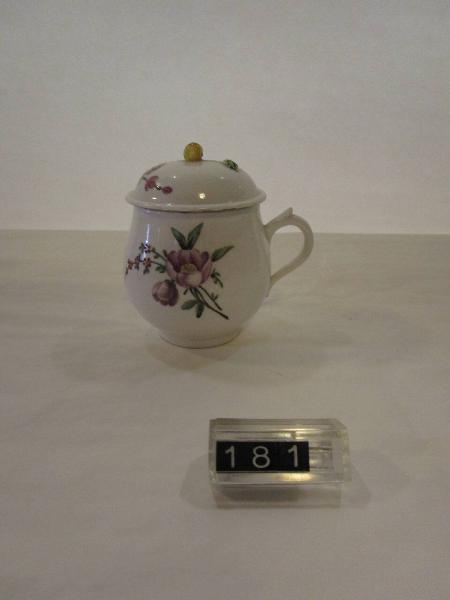 Portacrema con manico e coperchio sormontato da un frutto. Decorazione policroma di fiori raccolti a mazzo e di gambi fioriti sparsi. Tipico prodotto della manifattura piemontese durante il periodo della direzione di Vittorio Amedeo Gioanetti (1780-96).