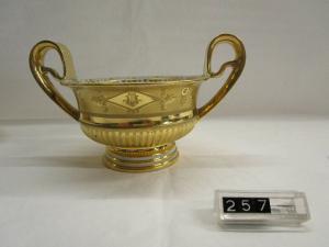 Tazza a due anse a nastro dorate con voluta trasversale a ponte. Sul corpo esterno larga fascia anulare in oro opaco con graffito, quattro losanghe ornamentali recanti al centro una cetra; negli intervalli piccolo fregio floreale. La parte inferiore della tazza è a baccellature a fondo in oro. Triplice cerchio dorato alla base. Internamente riserva anulare bianca decorata di fregi floreali in oro.