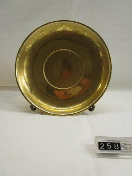 Piattino con parte inferiore baccellata a fondo oro opaco con zona anulare periferica decorata di sei losanghe graffite in oro con al centro una cetra; negli intervalli piccolo fregio floreale. Al centro lieve baccellatura che delimita una zona circolare, decorazione graffita in oro di rodetta centrale e di corona periferica. La tazza a cui corrisponde è inv. 257.