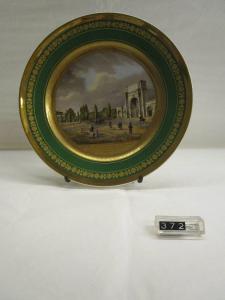 Piatto tondo con decorazione policroma raffigurante una veduta della Porta Guillaume di Bruxelles con personaggi a cavallo e in carrozza. La scena è compresa entro una cornice circolare i foglione in oro graffito e reca in basso la scritta in oro "Vue de la Porte Guillame". Tesa a fondo verde unito con due filettature in oro, largo orlo dorato seguito da una corona di fiorellini dorati.