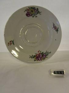 Piatto tondo con incavo circolare e corona anulare a leggero rilievo. Sulla testa, nei due campi opposti (ore 12 e ore 6), fiori policromi raccolti a mazzo e ramo di fiorellini nei due lati opposti (ore 3 e ore 9). (probabilmente questo piatto non è pertinente con la tazza da brodo inv.514)