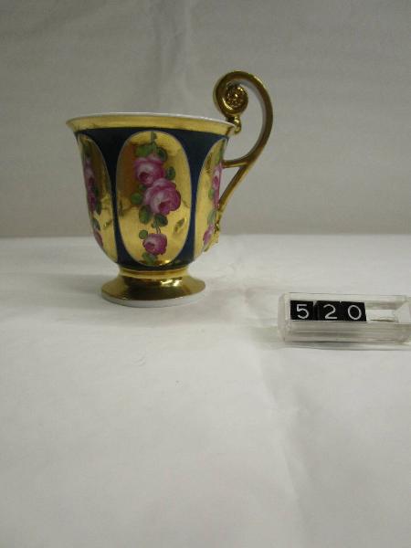 Tazzina da caffè a calice, con manico ricurvo, in stile impero, desinente a mascheroni. Interno dorato. All'esterno sei medaglioni ovali a fondo oro decorato di tralci di rose; negli intervalli decorazione verde scuro. Dorature sul manico e alla base.
