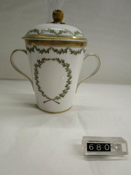 Tazza trembleuse troncoconica a due manici con coperchio. Sul bordo superiore presenta una filettatura dorata percorsa da una ghirlanda; al centro, sui due lati opposti, ci è una corona di quercia verde con delle bacche. Filettature in oro alla base e sui manici. Il coperchio ha il bordo filettato in oro con ghirlandina e pomolo raffigurante un frutto giallo a foglie dorate in rilievo. Il modello, noto in più varianti deriva dalla Tasse à lait, prodotta a Vincennes a partire dal 1754 non obbligatoriamente completata da un piattino trembleuse.