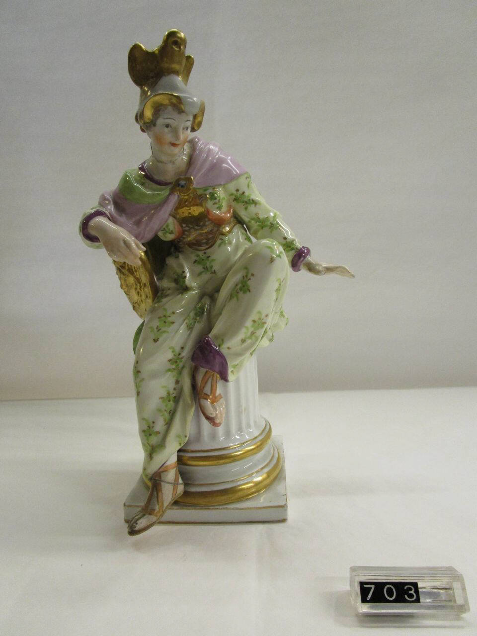 Statua a decorazione policroma con dorature su smalto bianco, raffigurante Minerva. La dea è raffigurata seduta sui resti di una colonna scanalata poggiante su base quadrata.Il suo capo è cinto da un elmo sormontato da una civetta, attributo iconografico della dea; col braccio destro sostiene uno scudo decorato con la testa di Medusa in rilievo.La testa è restaurata. Come la precedente (inv.702) appartiene al centro tavola della Corte Imperiale di Berlino.
