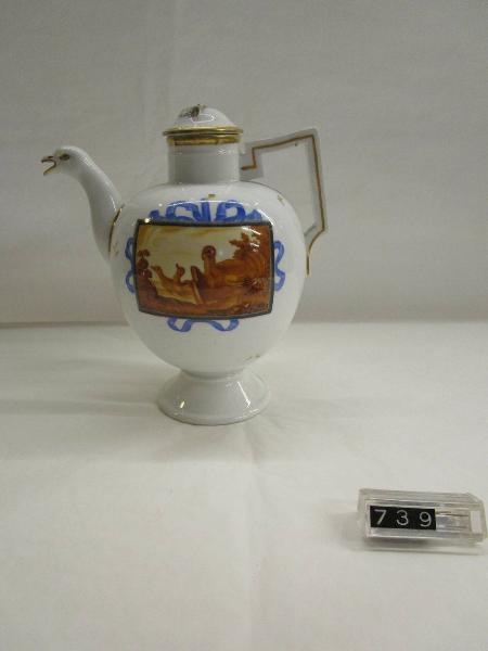 Caffettiera con manico squadrato a nastro, collo breve cilindrico con versatorio a forma di testa di anatra. Nei due campi opposti, un riquadro rettangolare con nastri azzurri, decorato in chiaro scuro bruno, con raffigurazione da una parte di anatre e dall'altra di un tacchino. Profilature in oro. Il coperchio, di cui manca il pomolo, è decorato con un medaglione rettangolare col medesimo soggetto.