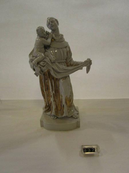 Figura a smalto bianco, con tracce di doratura, di S. Antonio da Padova. Il santo è raffigurato stante con il Bambino nudo in braccio seduto sopra al libro che tiene nella mano destra. Mancano le dita della mano. L'opera viene attribuita sia a Carlo Coccorese poiché le due CC sono la sua firma ma è anche accostata all'opera di Francesco trevisani e Placido Costanzi.