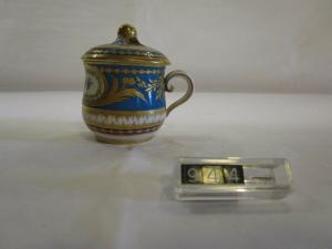 Tazza da crema ad orecchio con coperchio con pomolo a forma di frutto, a rilievo e dorato. Alla base vi sono arabeschi in oro e viola; al centro è posto un medaglione ellittico,delineato in oro, con tralcio di rose su fondo bianco e ghirlandina di foglie verdi. Ai lati del medaglione vi sono due foglie arcuate e foglioline su sfondo blu celeste. Sull'orlo delineatura di in oro. Coperchio decorato a girali in oro su sfondo blu celeste, fascia dorata e una violacea. La tazza appartiene al servizio donato nel 1786 all'arciduca Ferdinando d'Austria da Luigi XVI, la tazza è ensuite con la salsiera inv.948.