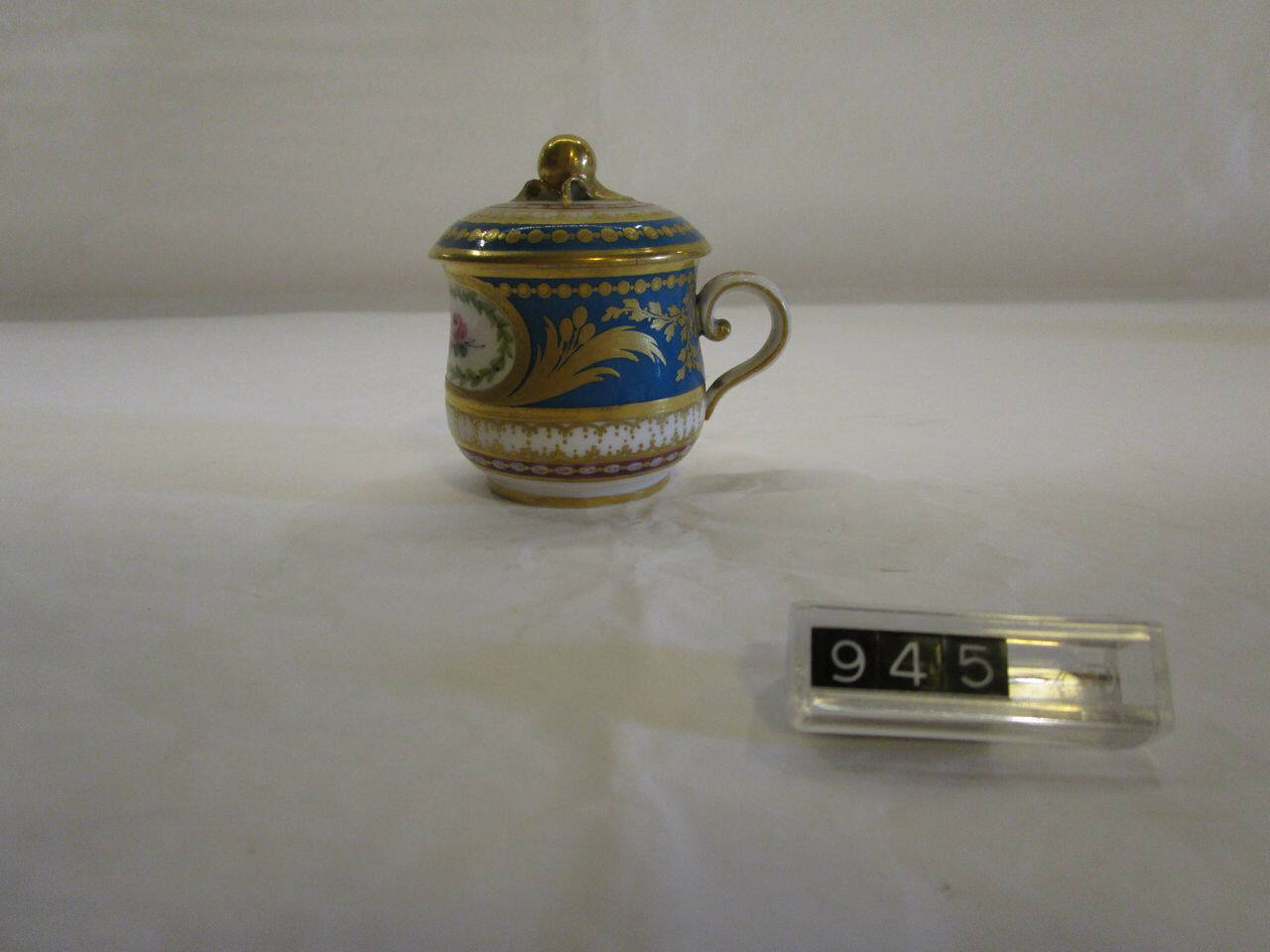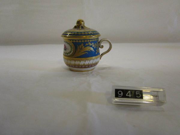 Tazza da crema ad orecchio con coperchio con pomolo a forma di frutto, a rilievo e dorato. Alla base vi sono arabeschi in oro e viola; al centro è posto un medaglione ellittico,delineato in oro, con tralcio di rose su fondo bianco e ghirlandina di foglie verdi. Ai lati del medaglione vi sono due foglie arcuate e foglioline su sfondo blu celeste. Sull'orlo delineatura di in oro. Coperchio decorato a girali in oro su sfondo blu celeste, fascia dorata e una violacea. La tazza appartiene al servizio donato nel 1786 all'arciduca Ferdinando d'Austria da Luigi XVI, la tazza è ensuite con la salsiera inv.948.