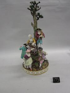 Gruppo raffigurante sei personaggi ed un cane. Il soggetto della rappresentazione è pastorale, posto su un masso roccioso bruno da cui si eleva un albero con pochi rami e rare foglie. Decorazione policroma con profilature oro. Quattro dei sei personaggi sono distribuiti alla base: una ragazza e un giovane danzano mentre un cavaliere versa da bere ad una donna anch'essa seduta e con un piatto sulle ginocchia (manca una delle mani della donna). Più in alto, in piedi sopra un masso sporgente, una suonatrice di ghironda e un suonatore di cornamusa. Base circolare a tamburo con decorazione di cerchi rilevati e dorati. Al rovescio la marca: spade incrociate blu.